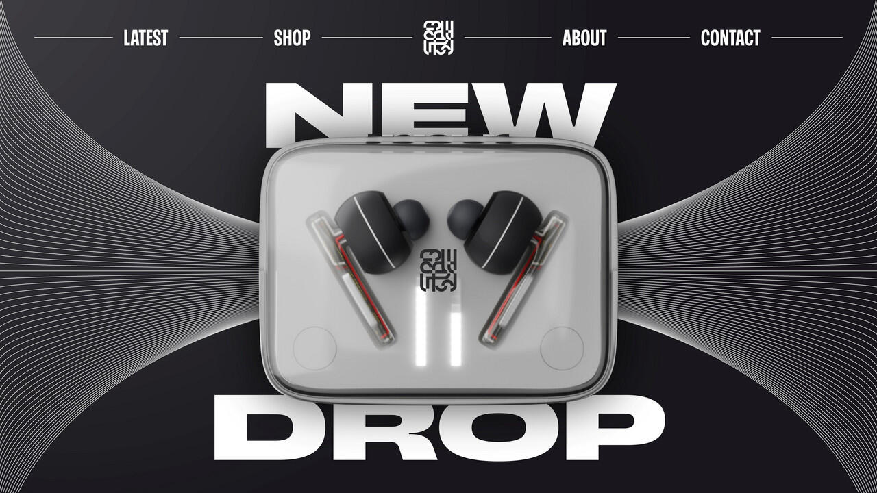 “Collectivist” is a mockup hero webpage showcasing a set of high-tech styled earbuds. The brand, product, and page layout are all original work, with the branding and layout produced in Adobe Illustrator and the product itself designed and rendered in Blender.